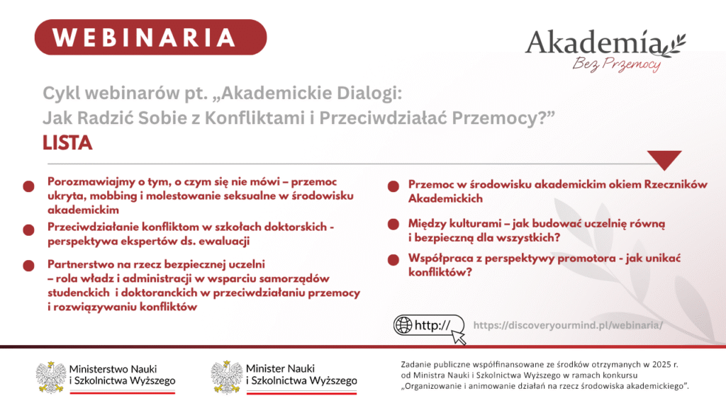 Szkolenie: Szkolenie skierowane jest do członków społeczności akademickiej – kadry kierowniczej, dydaktycznej, administracyjnej oraz doktorantów i studentów – zainteresowanych przeciwdziałaniem mobbingowi i molestowaniu w środowisku naukowym. Podczas spotkania uczestnicy zapoznają się z aktualnymi regulacjami prawnymi dotyczącymi mobbingu i molestowania (w tym molestowania seksualnego), z uwzględnieniem planowanym zmian. Ponadto omówione zostaną praktyczne mechanizmy reagowania i zapobiegania takim zjawiskom. Podczas szkolenia zaprezentowane zostaną także wewnętrzne procedury obowiązujące na uczelniach i w instytutach badawczych oraz dobre praktyki budowania bezpiecznego i wspierającego środowiska pracy i nauki.