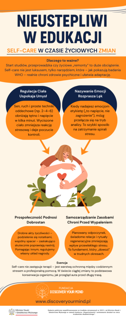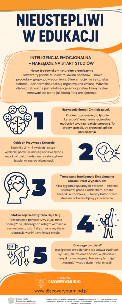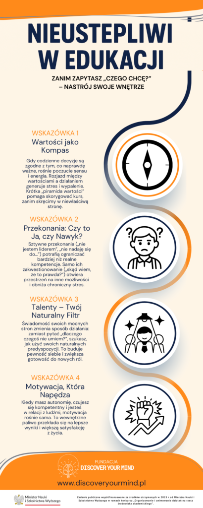 Poznaj projekt „Nieustępliwi w edukacji”  stawia czoła zjawisku porzucania studiów przez studentów i doktorantów w Polsce. Poprzez programy mentoringowe, warsztaty z zakresu zdrowia psychicznego oraz kampanię #STOPDropOut, projekt wspiera młodych ludzi w odnalezieniu równowagi, motywacji i pewności siebie w świecie akademickim.